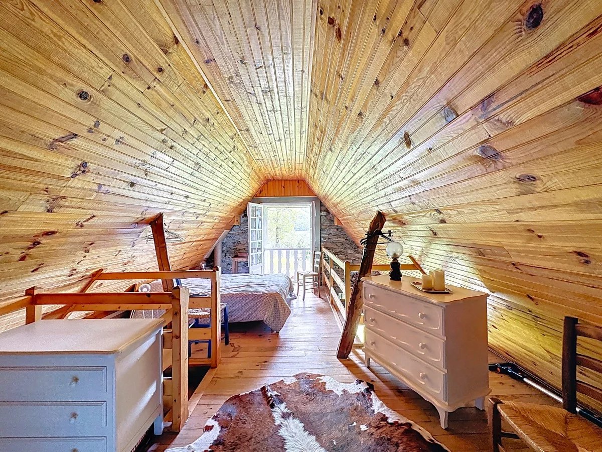 The ground floor has a living space with fireplace, an open fitted kitchen and washroom with toilet. Upstairs is a dormitory with three 140cm beds to sleep 6 persons, and a storage space.